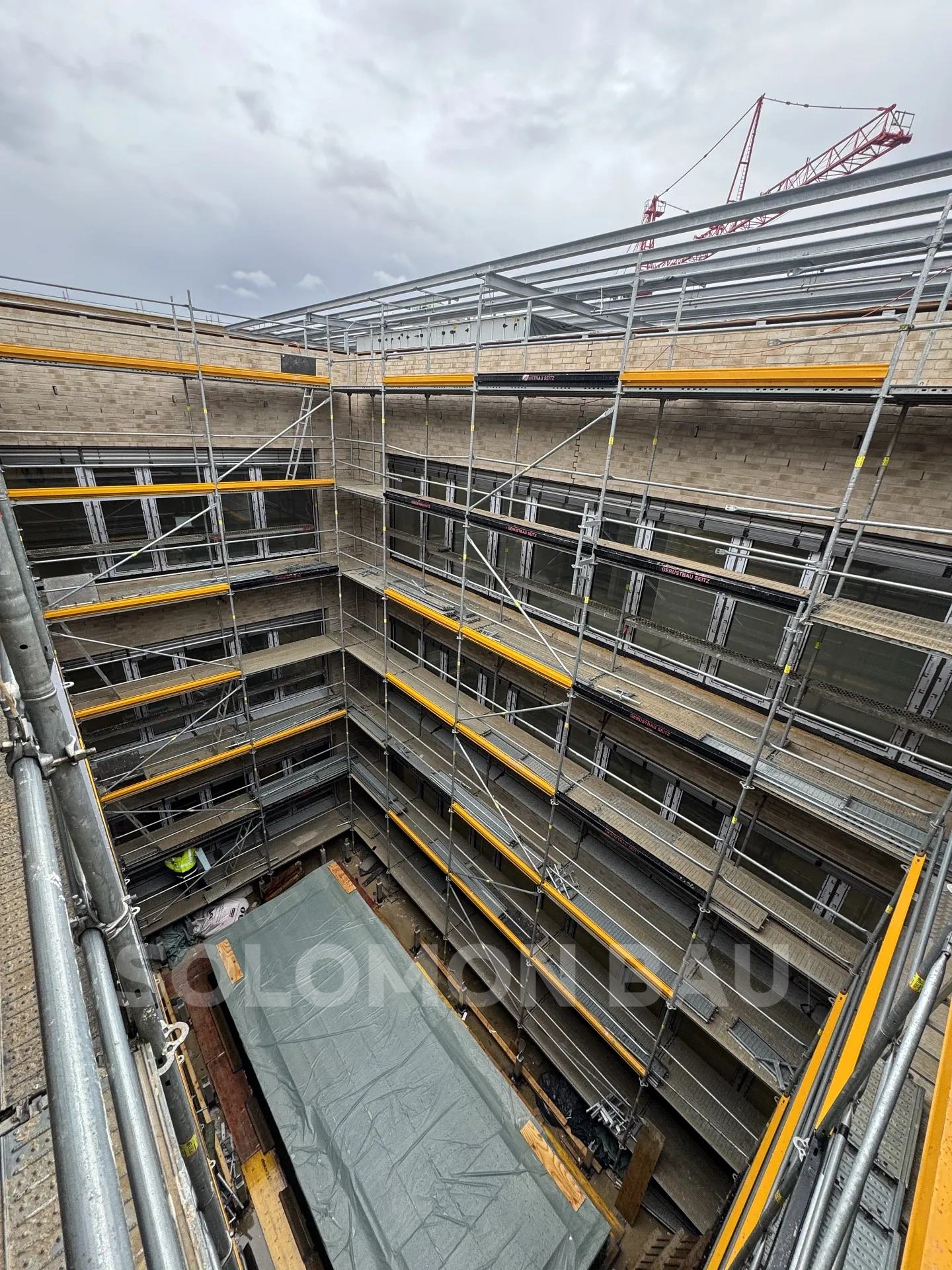 Gebäude mit anspruchsvoller Klinkerfassade und besonderen Ausbildungen im Erdgeschoss. Ausführung der Klinkerarbeiten mit NF-Stein, Fugenglattstrich , 3D-Ausbildung im Erdgeschoss inklusive Montage von 75 cm breiten Stürzen sowie Einbau von Konsolen für eine begrünte Fassade; die Arbeiten wurden innerhalb von fünf Monaten abgeschlossen. Quelle